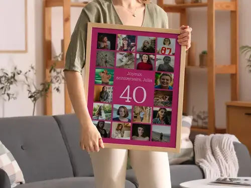 Affinez chaque détail: police, taille et couleur du nom et du message, épaisseur des marges, teinte du fond ou texture, style Polaroid avec légende, intensité des ombres, arrondis, hiérarchie visuelle entre le chiffre et les photos, disposition en portrait ou paysage pour s’adapter à votre mur.