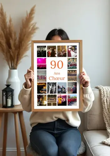Personnalisez maintenant. Exemple: la composition Jubilé 90 affiche un grand 90 au centre, le prénom au-dessus et un message en dessous, entourés de 20 à 80 photos en grille. Le chiffre, le nom, les mots, la quantité d’images, le fond, les couleurs et l’orientation se règlent en un clic.