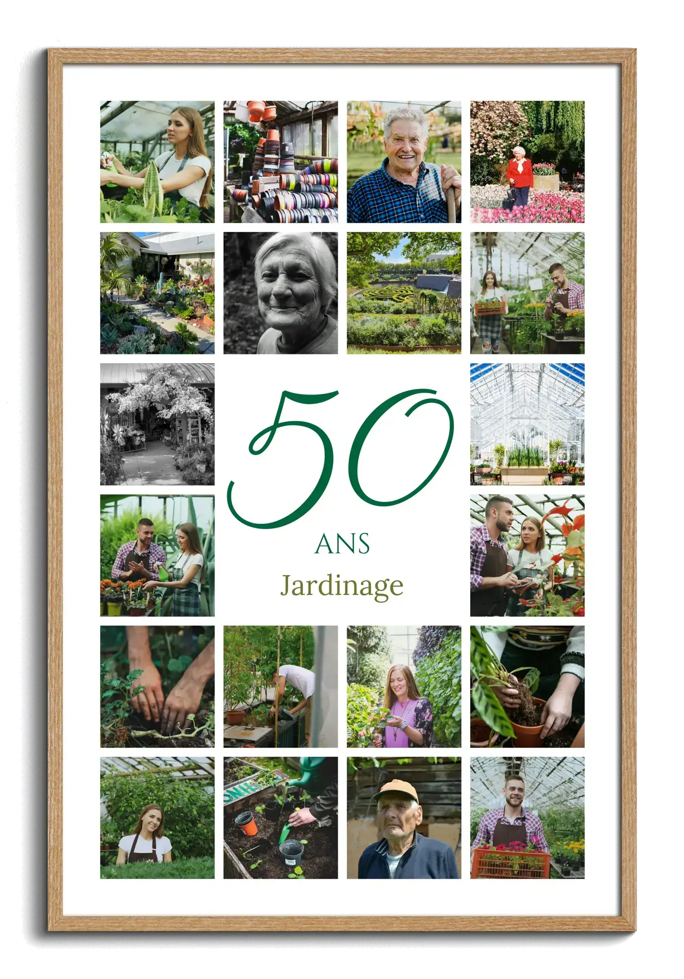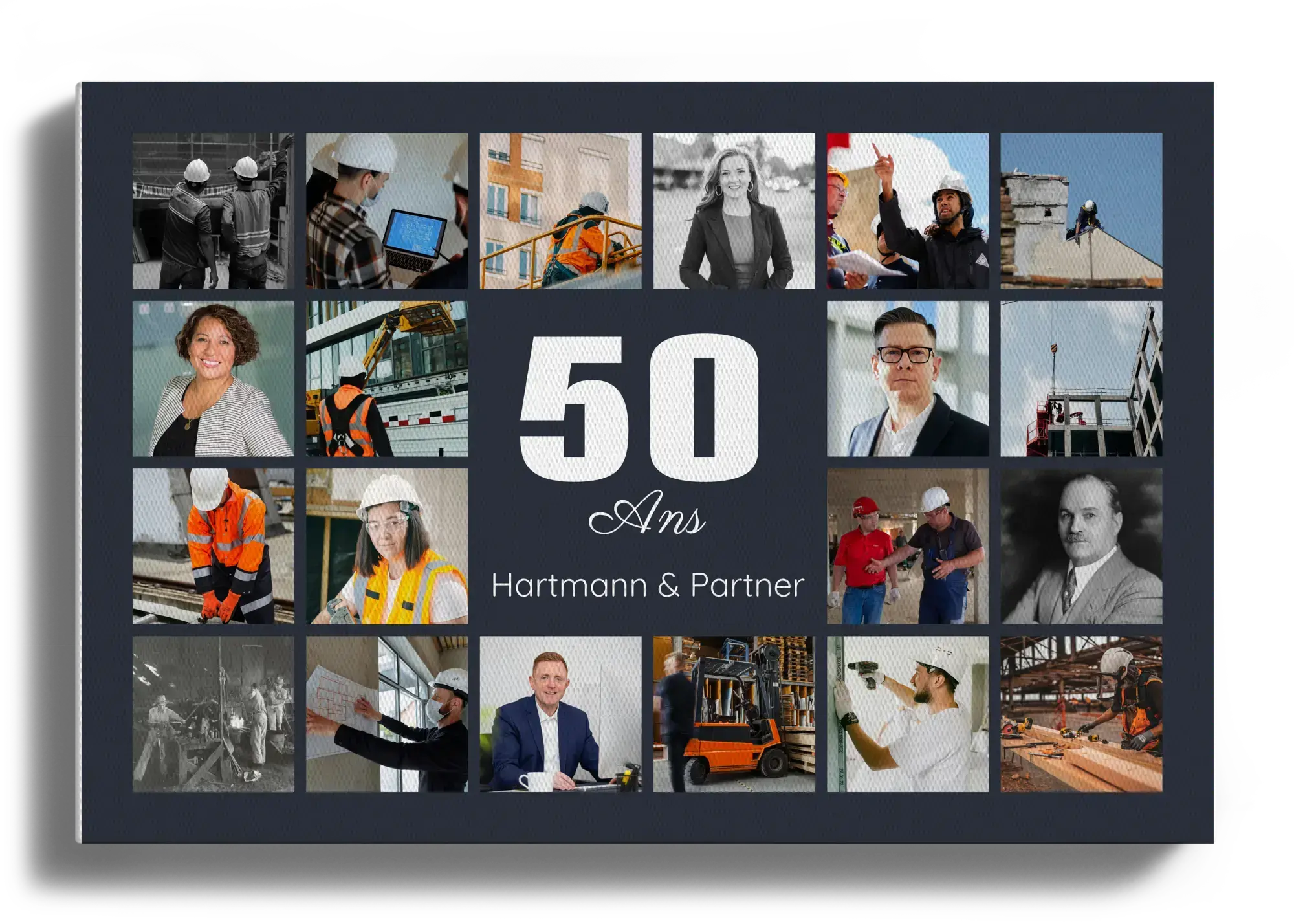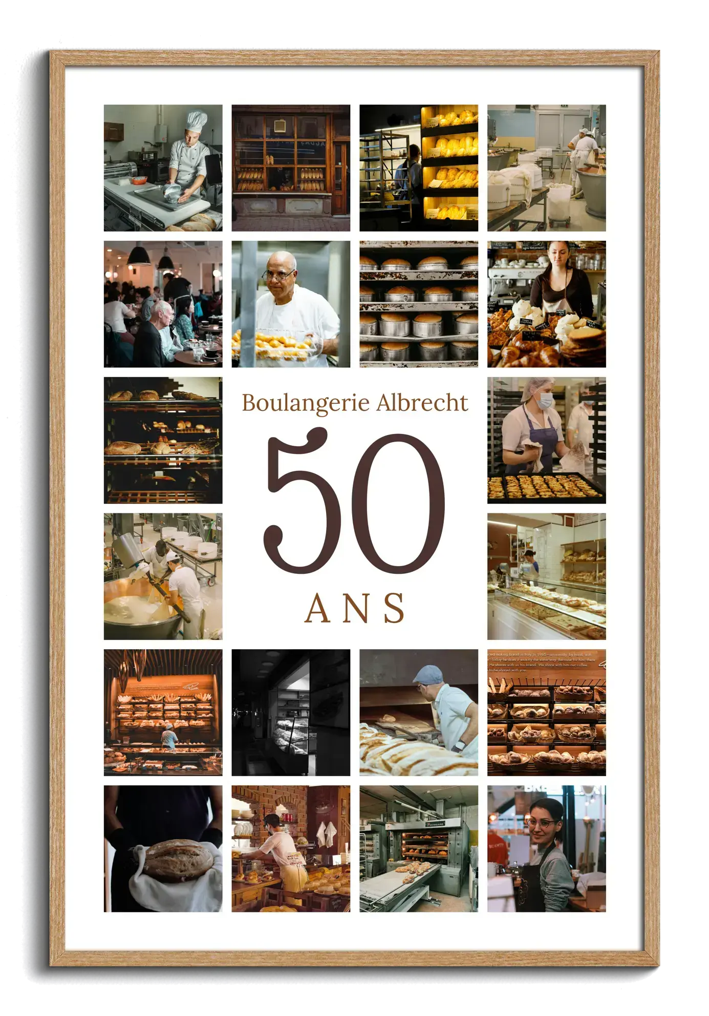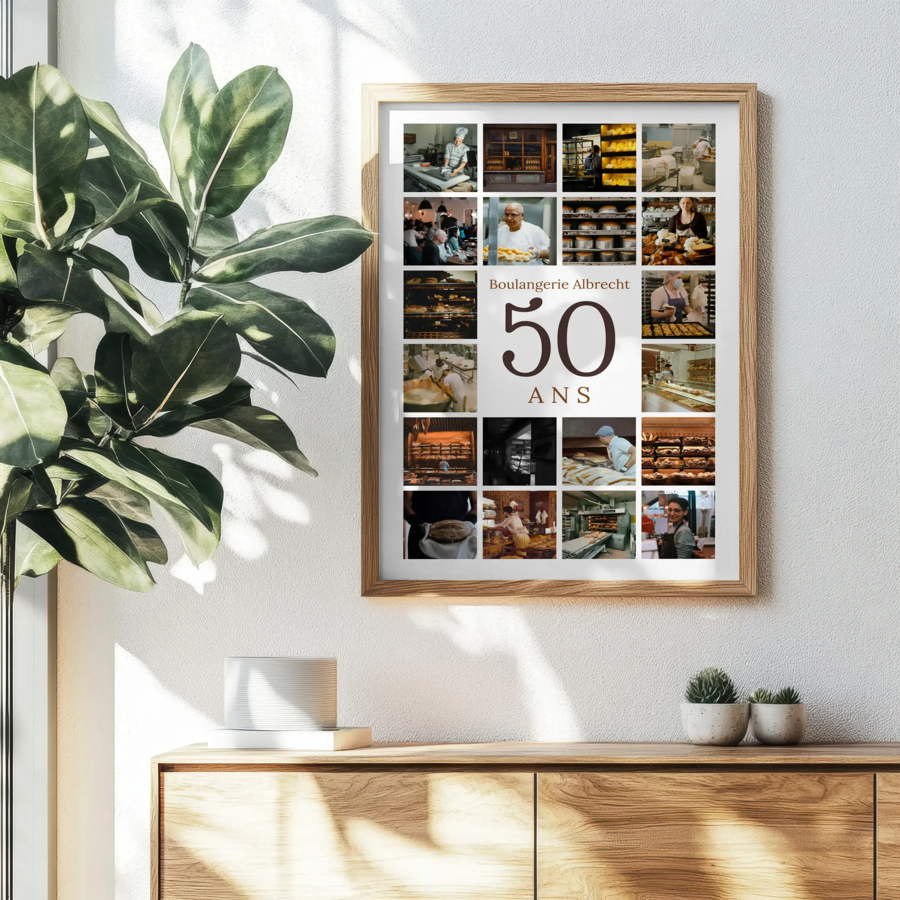 Créez votre collage photo 50 ans d’entreprise — 20–80 photos, nom et texte perso