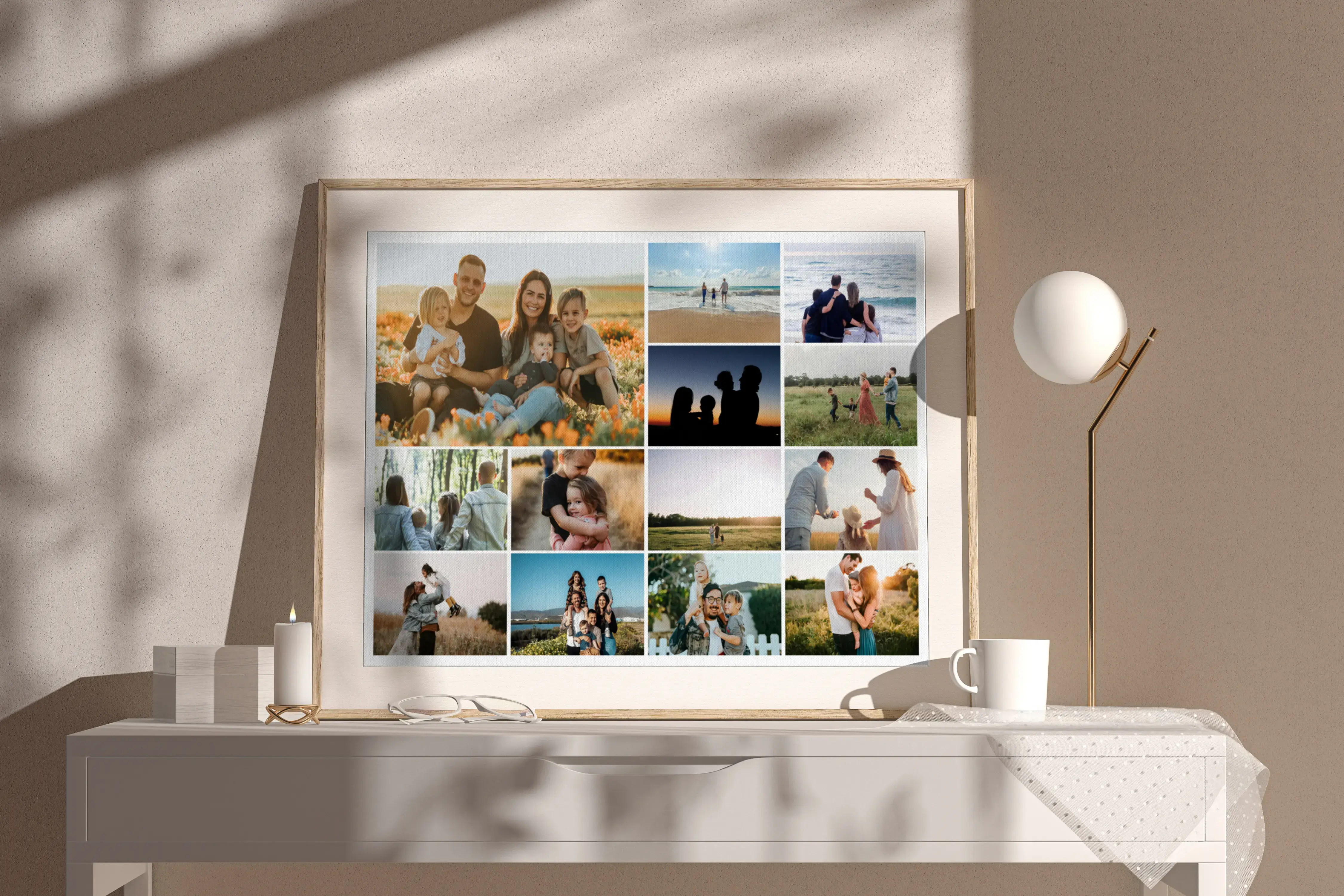 Photos de famille en collages variés, avec textes personnalisés pour un souvenir unique.