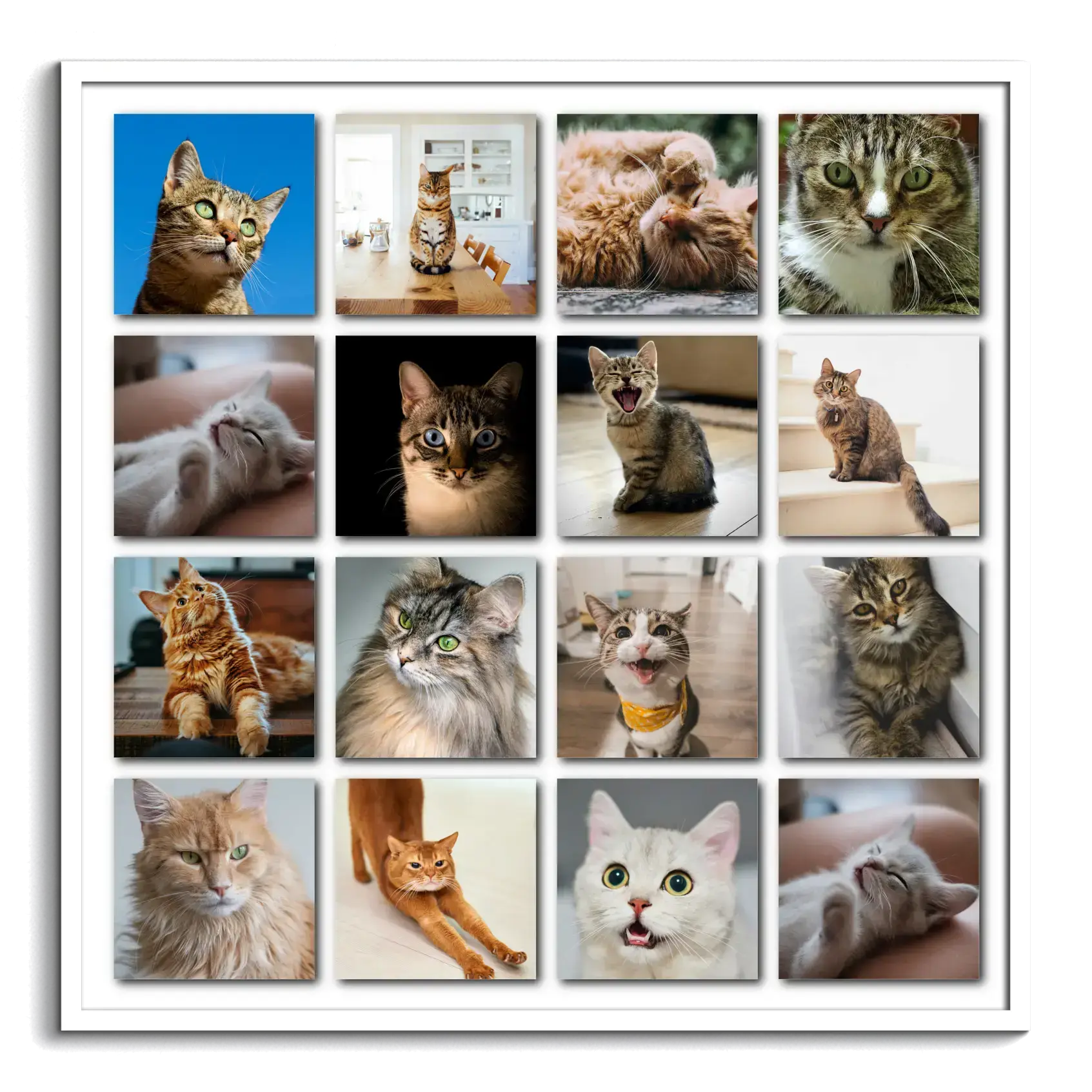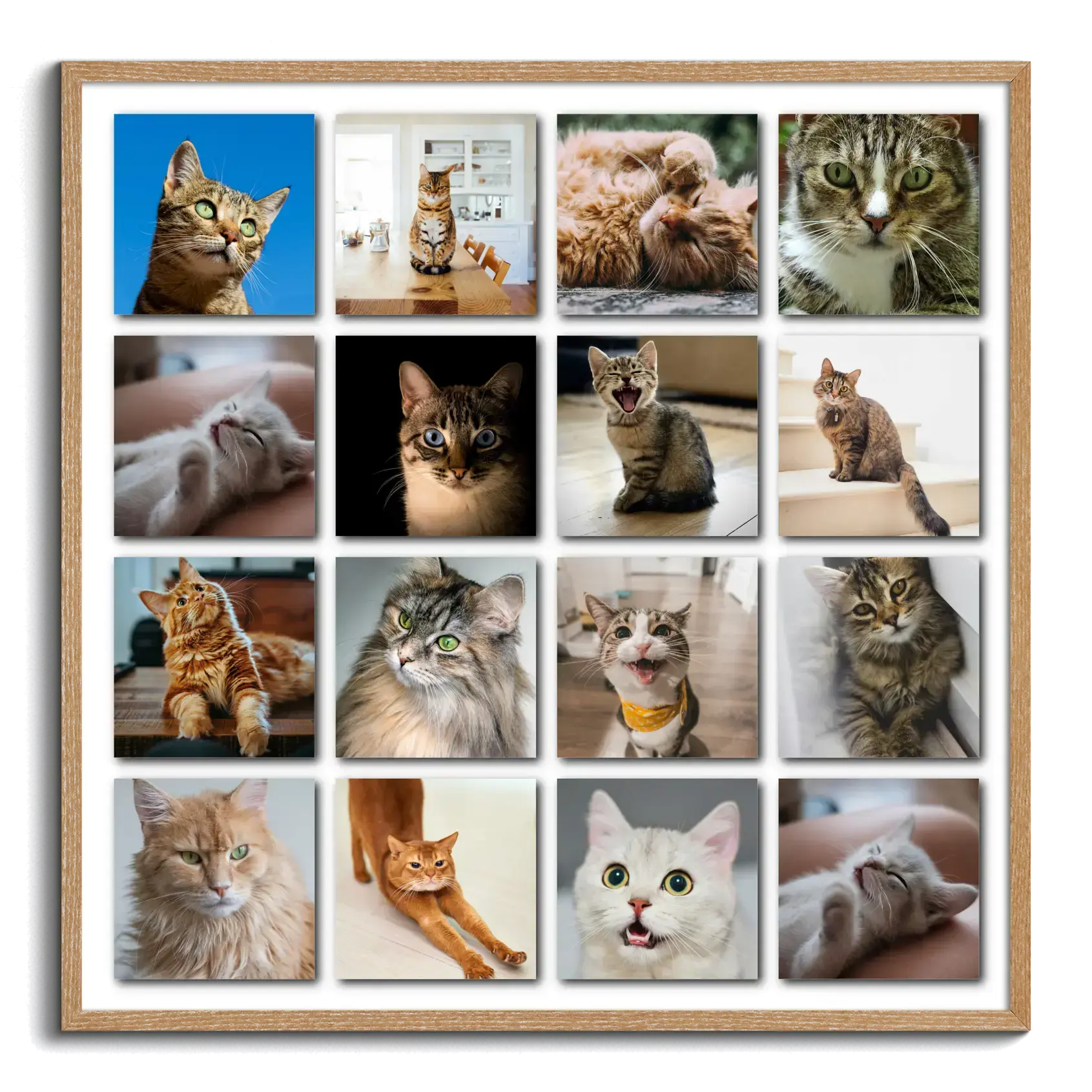 Passe à l’action et crée en ligne un collage Polaroid de chat. Exemple concret: rassembler ses plus belles photos et ajouter un titre perso comme Floris le chat ou simplement son prénom. Sélectionner la taille, ajuster la mise en page, valider et commander en quelques clics.