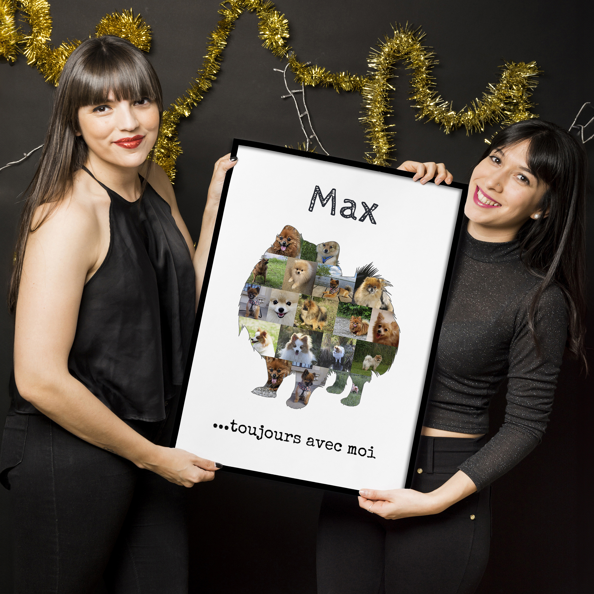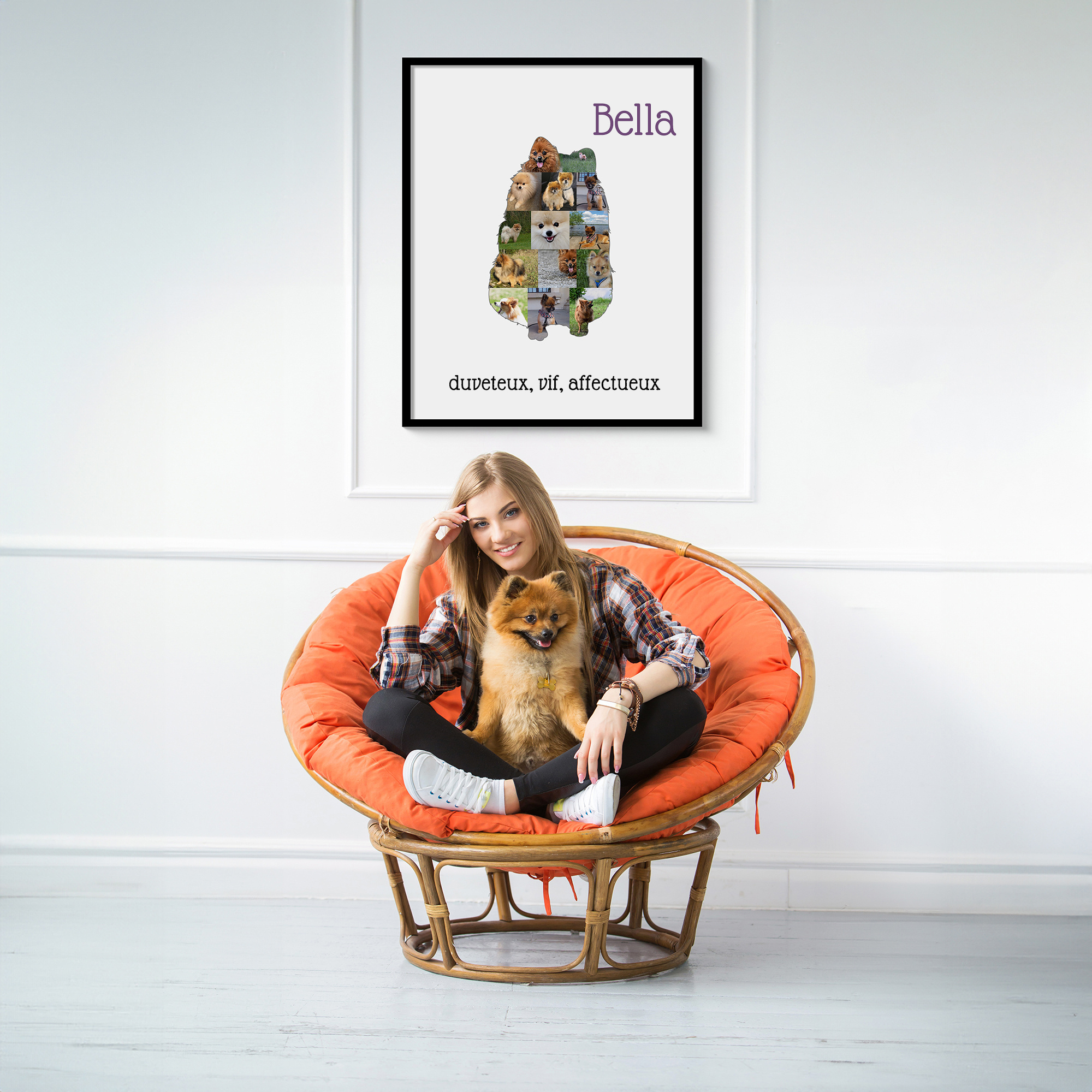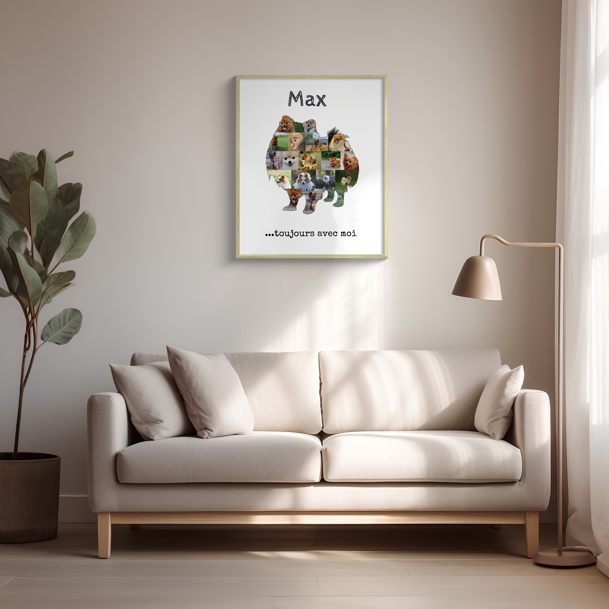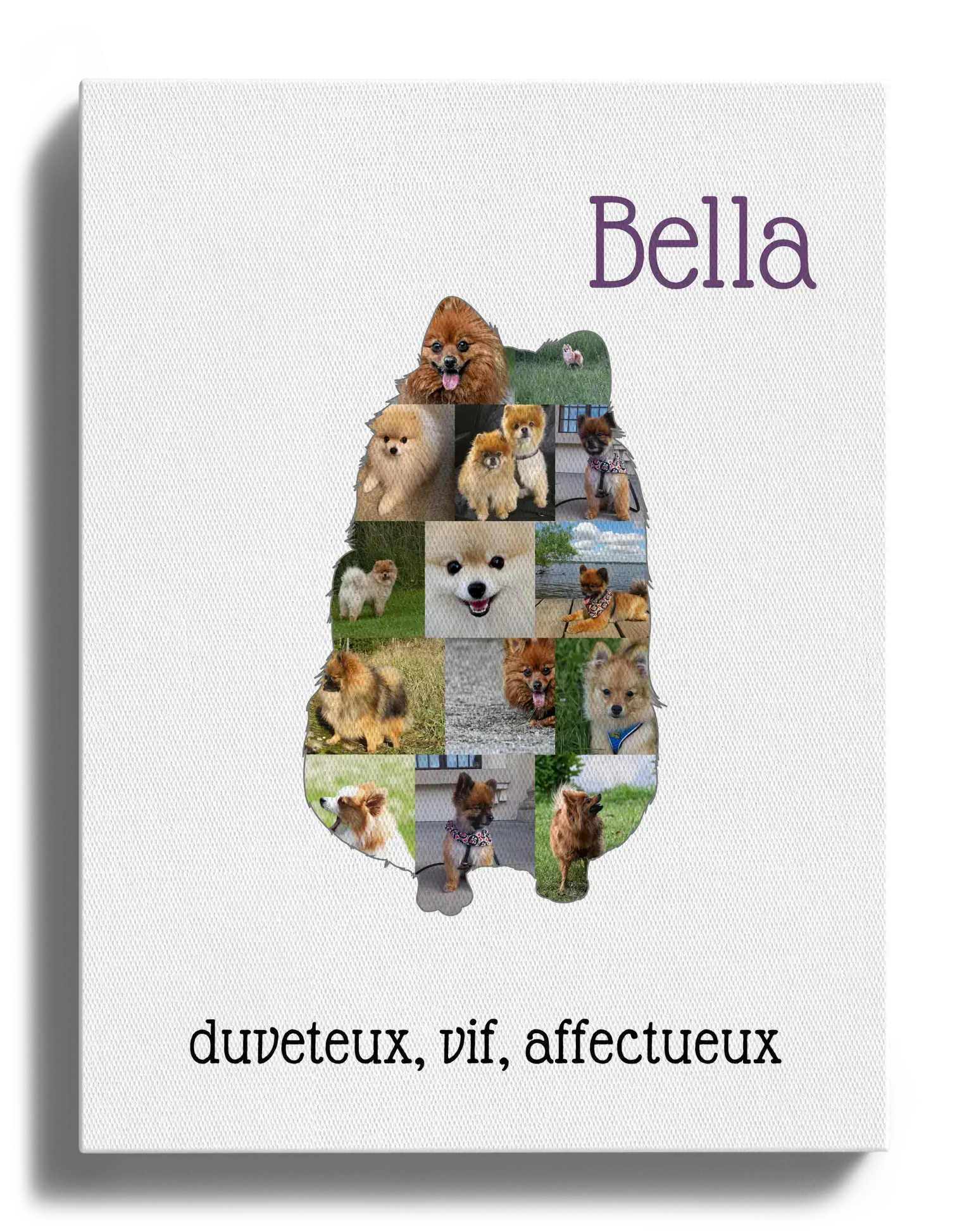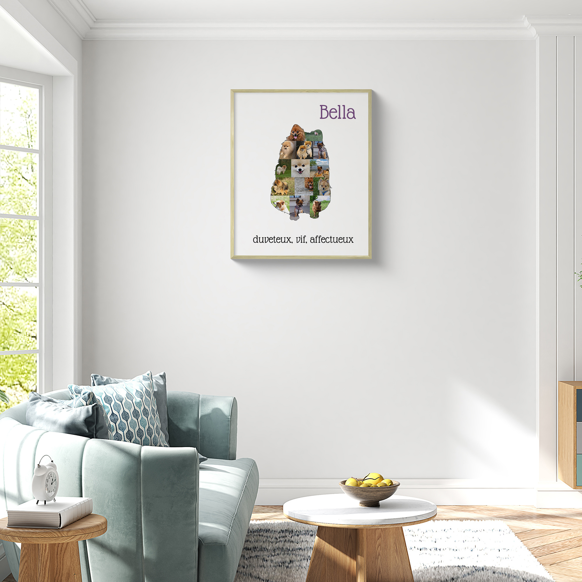 Créez votre propre collage photo personnalisé dès maintenant ! Imaginez la silhouette d'un charmant dwarf-spitz composée de 15 à 20 de vos photos favorites. Ajoutez-y un texte unique tel que "toujours avec moi" ou "doux, vif, loyal". Parfait pour les amoureux des chiens qui souhaitent garder un souvenir original de leur compagnon à quatre pattes. À utiliser chez vous comme décoration ou à offrir.
