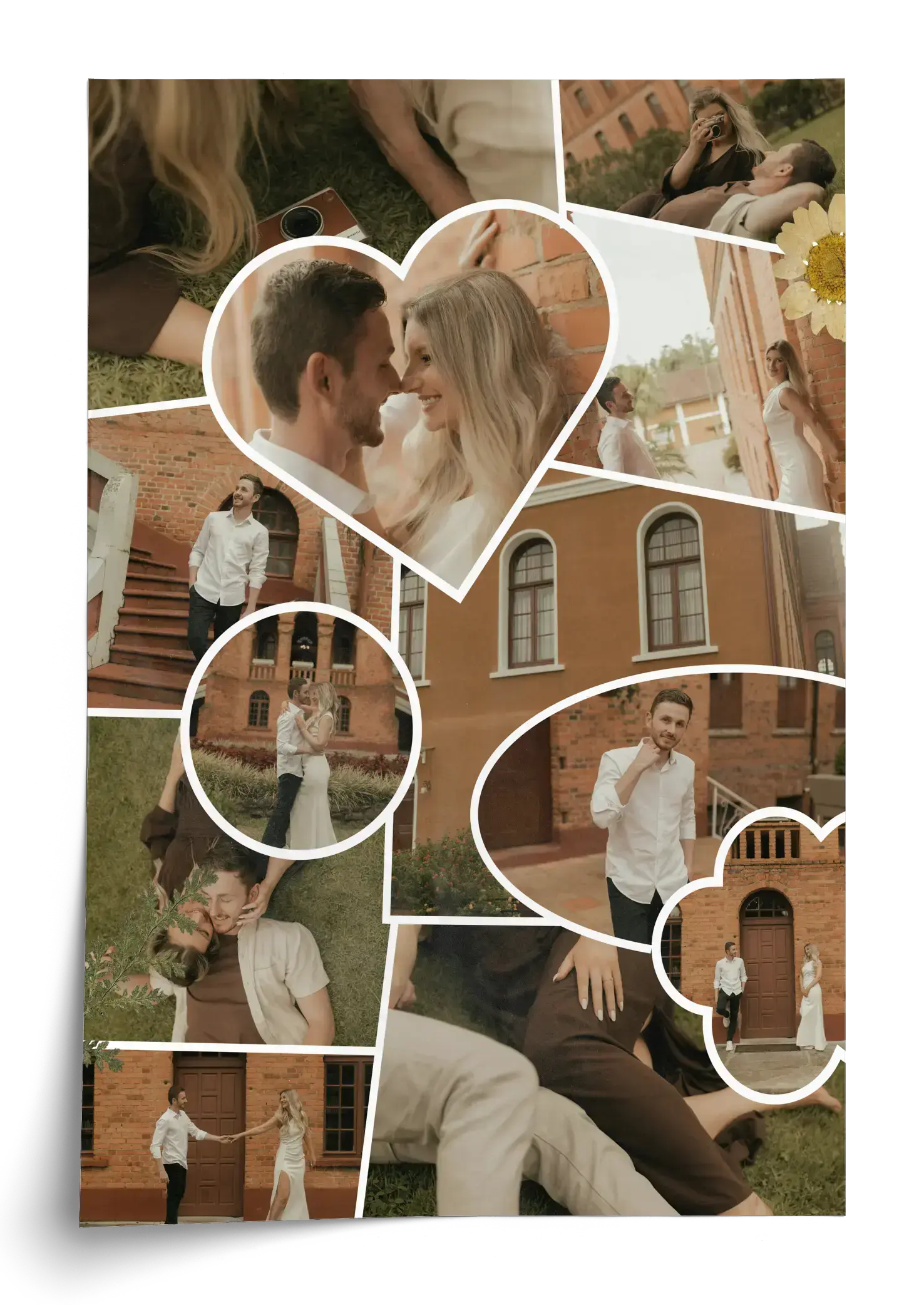 Créez dès maintenant une composition photo Scrapbook au style épuré pour mariage ou fiançailles. Plusieurs images semblent posées librement sur la page comme des tirages imprimés, sans texte et avec seulement quelques éléments décoratifs discrets. Un souvenir élégant, en format portrait ou paysage.