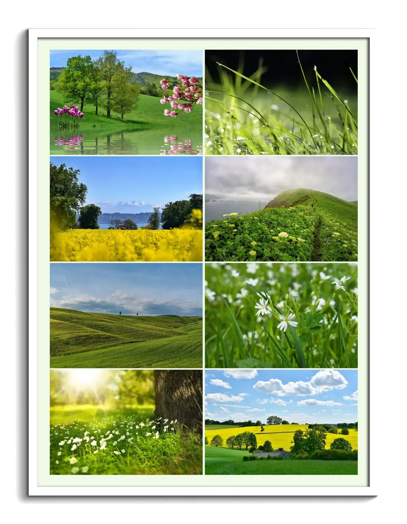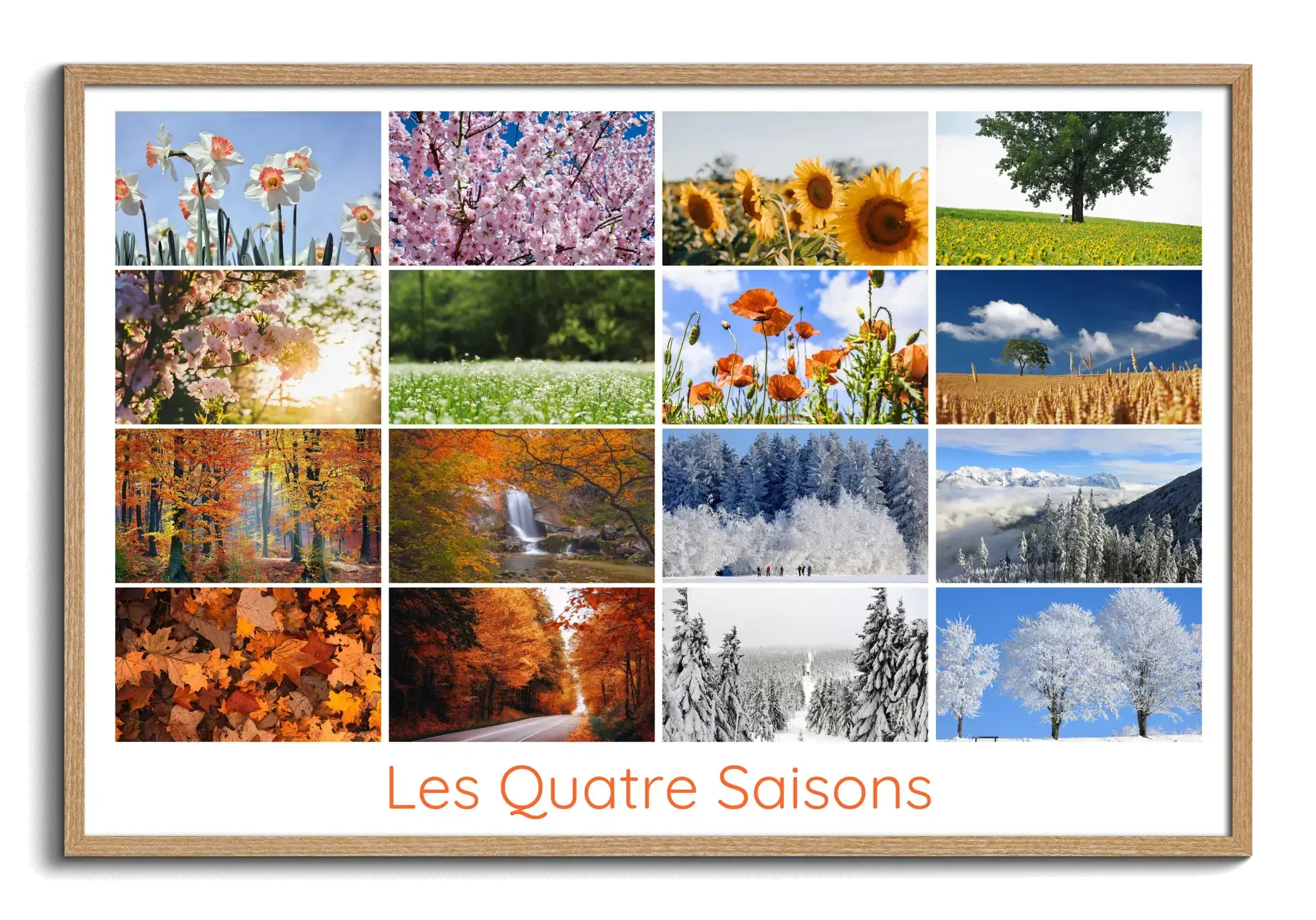 Créez maintenant une déco murale unique. Composez un collage nature autour des saisons: bourgeons et floraisons du printemps, prairies, arbres et fleurs d’été, feuillages chatoyants d’automne, forêts enneigées en hiver. Des modèles variés et un tirage premium magnifient paysages et animaux, du poster à la toile.