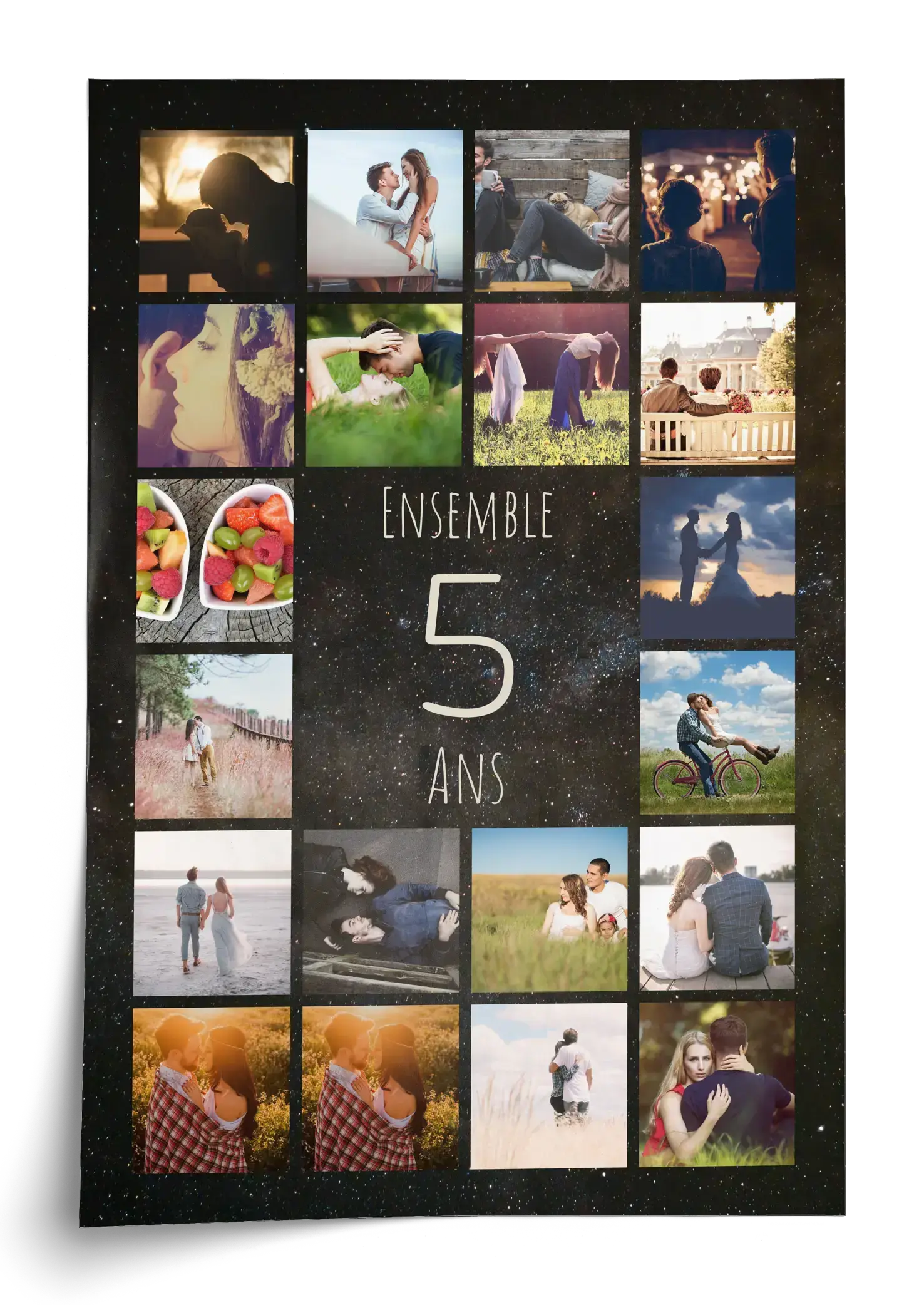 Crée et commande maintenant. Affiche Jubilé chiffre 5: une grande 5 au centre, un prénom au‑dessus, un message en dessous, 20 à 80 photos en grille autour. Idéale pour 5 ans ensemble, mariés ou en couple. Chiffre, textes, nombre d’images, fond, couleurs et format sont personnalisables.