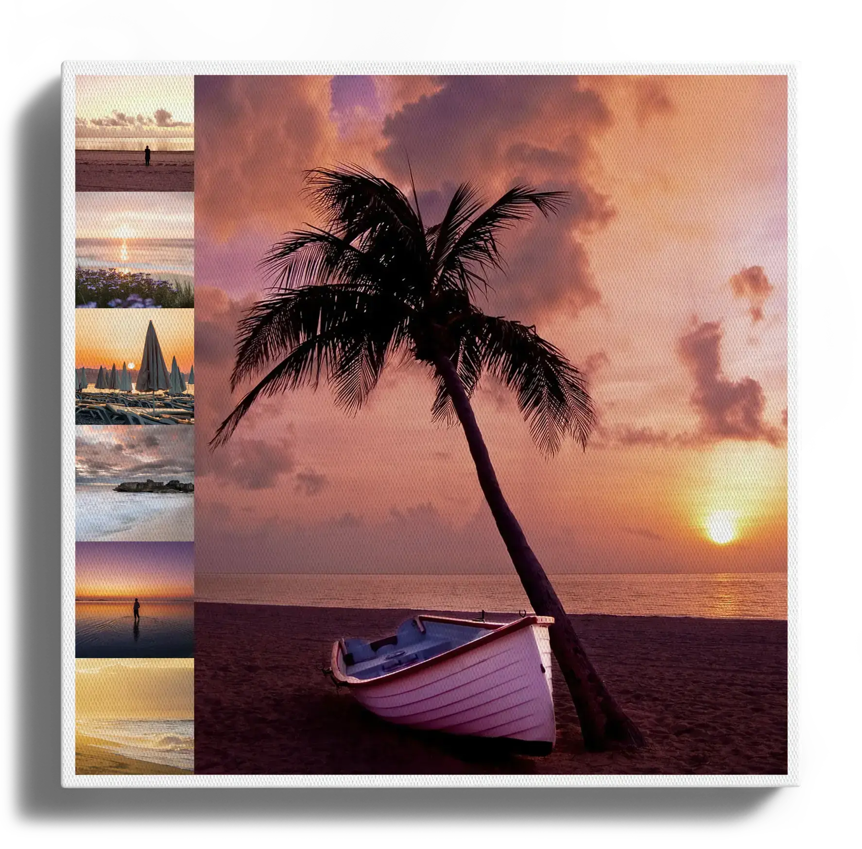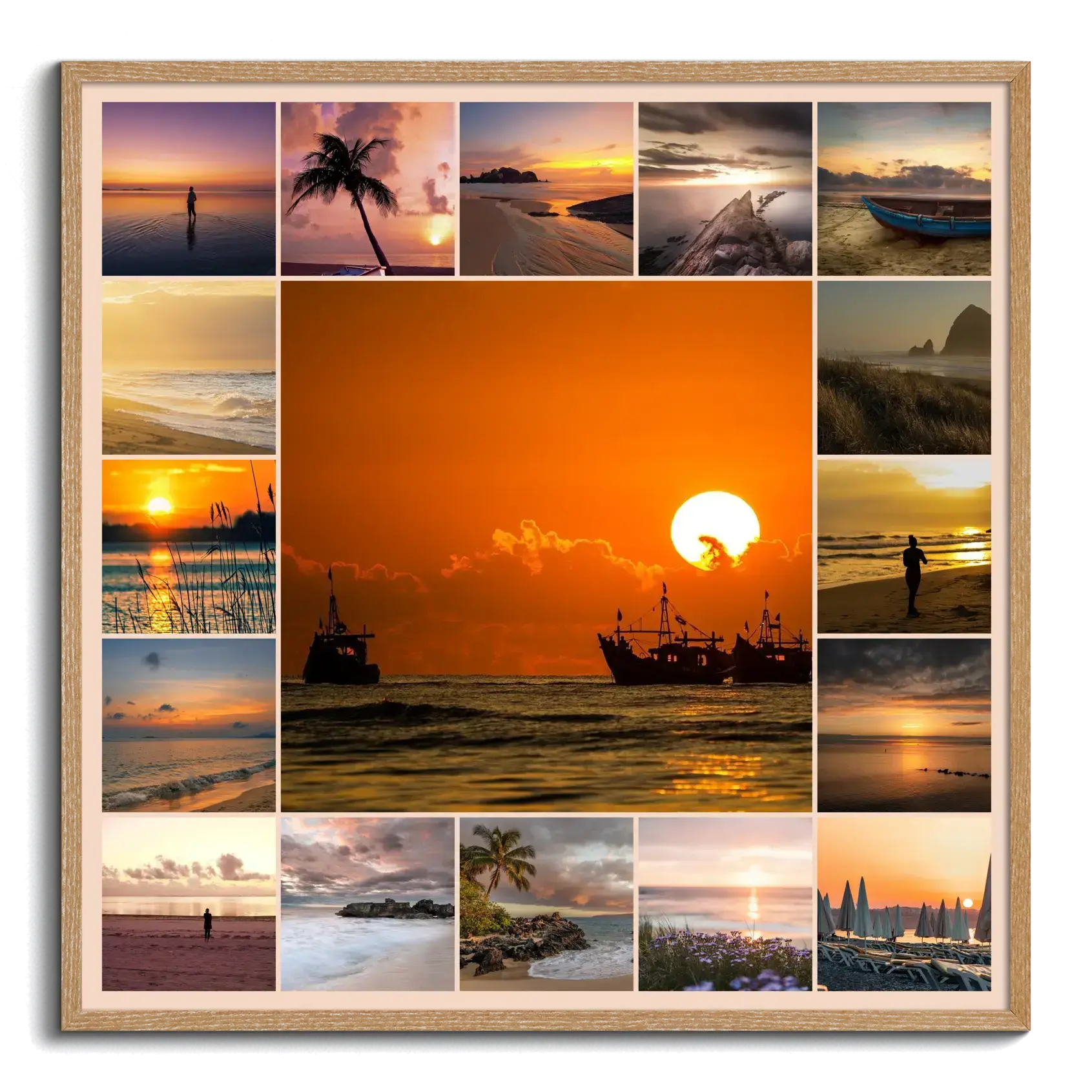 Tirages premium en collages: plages au couchant, palmiers, bateaux; lacs miroir, montagnes, neige.