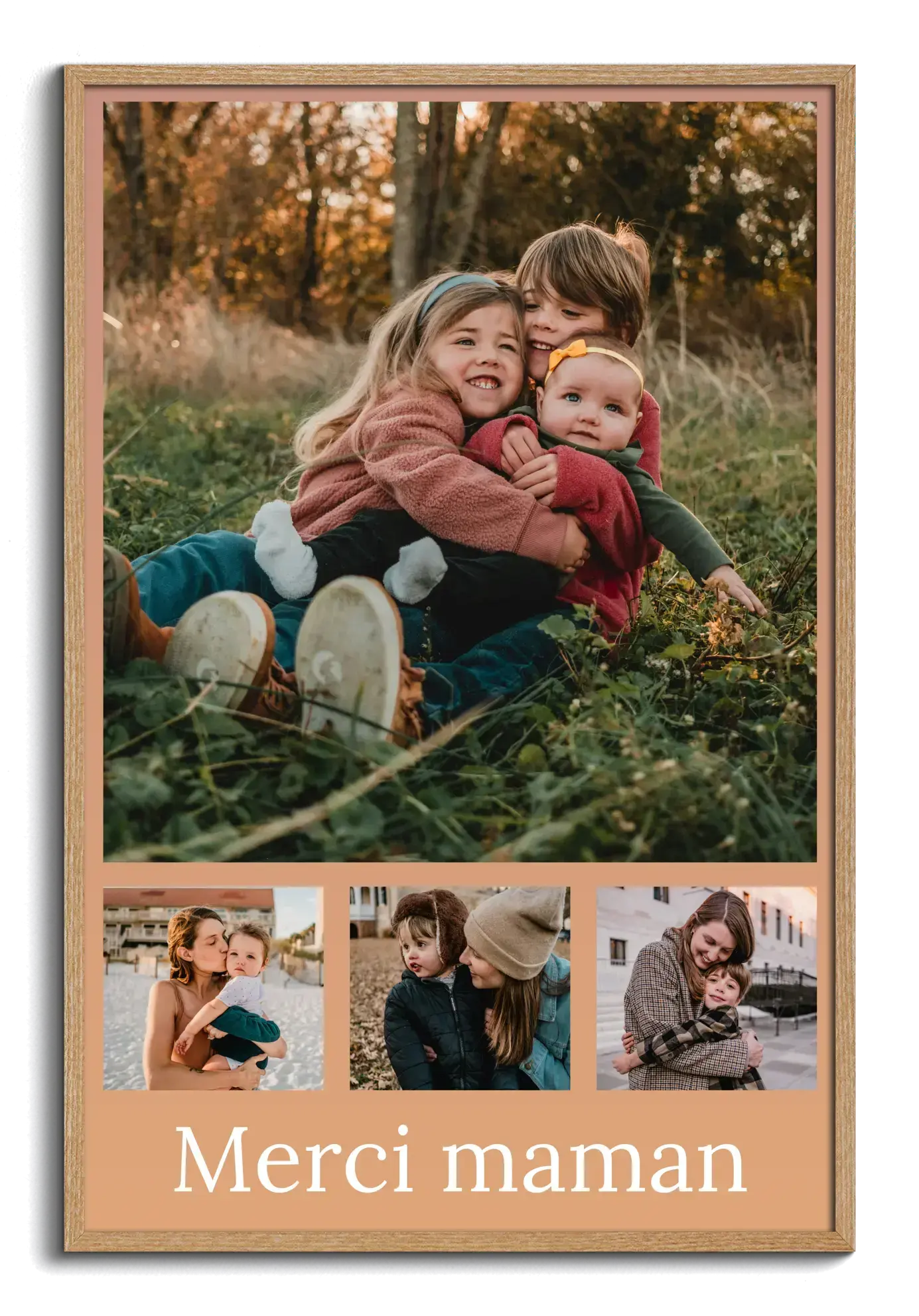 Créez et commandez en quelques clics. Exemple prêt à offrir pour la Fête des Mères ou des Pères: une affiche personnalisable réalisée par les enfants ou petits-enfants, avec gabarits cœur, texte ou chiffres. Ajoutez un message perso comme Bonne fête Maman ou Merci Papa, choisissez le nombre de photos, les couleurs et la taille.