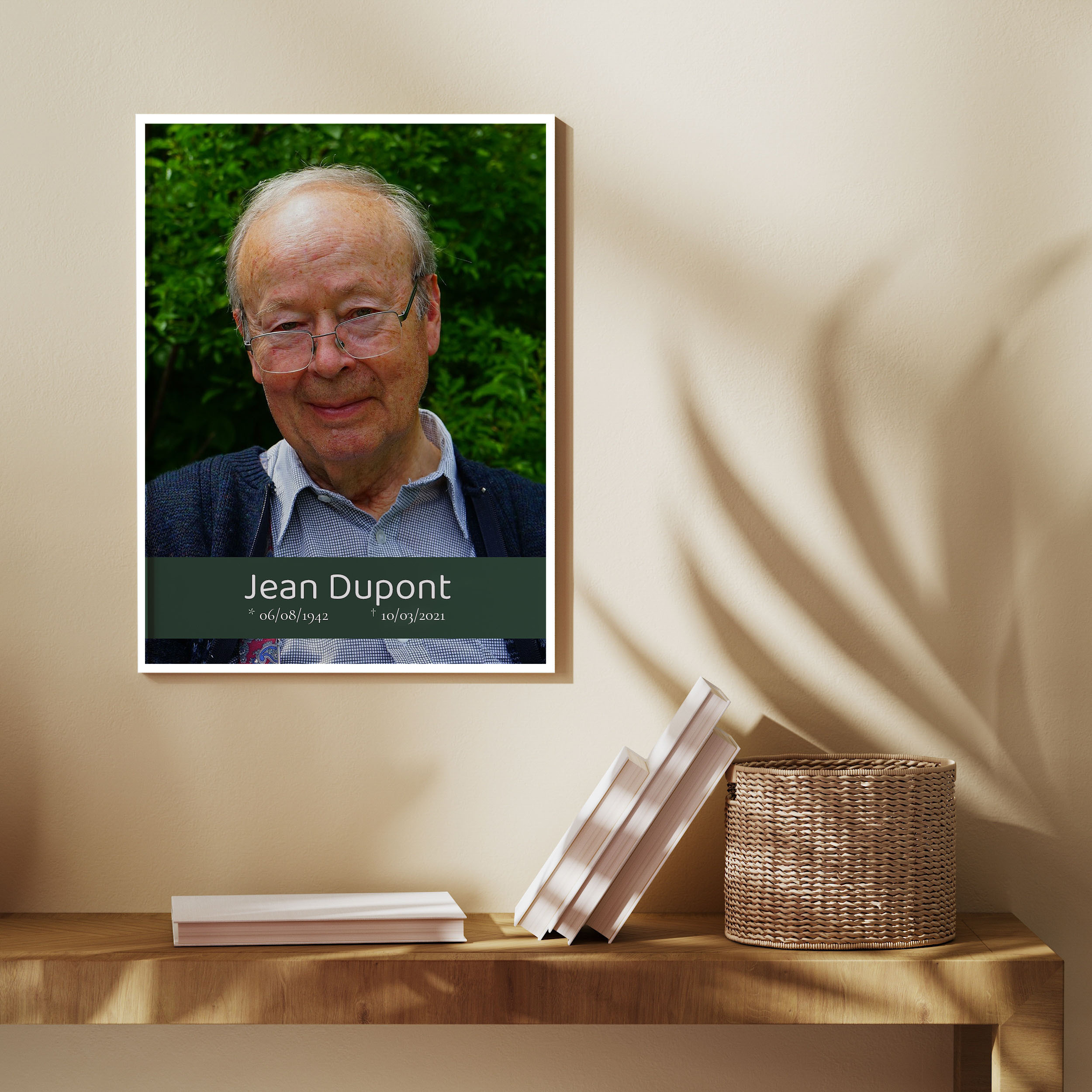 Créez un souvenir personnalisé touchant avec notre produit de collage photo sur mesure. Ce produit exemplaire présente une image commémorative personnalisée en l'honneur d'un être cher disparu. Une belle toile est agrémentée d'un portrait en grand format, accompagné d'une bannière sombre indiquant le nom, la date de naissance et de décès, créant ainsi un hommage élégant et durable pour les familles et amis désirant honorer leur mémoire. Personnalisez chaque détail selon vos souhaits pour une pièce unique pleine de signification.