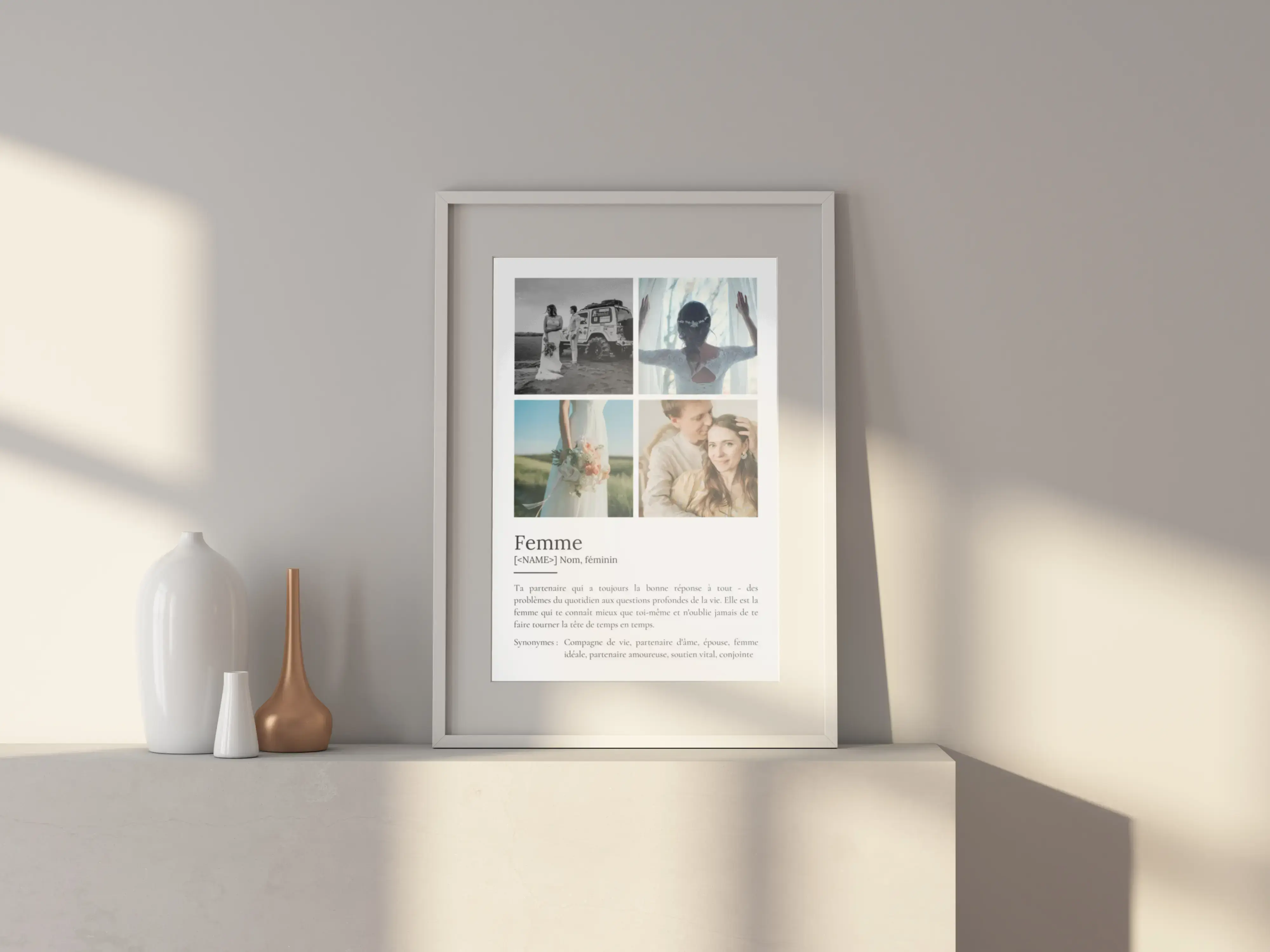 Créez votre propre poster définitions "Épouse" dans le style Duden et offrez un cadeau unique et personnalisé. Vous pouvez ajouter de 1 à 9 photos personnelles pour immortaliser vos moments précieux. Ajoutez ensuite une définition touchante qui décrit l'importance de votre partenaire dans votre vie, avec style et élégance.